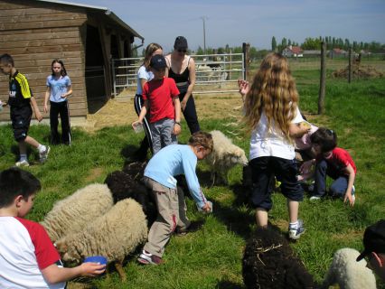 Puis, nous entrons dans le parc des moutons avec chacun un peu d'orge. Les brebis et les agneaux se jettent dessus, ça chatouille les mains ! Qu'est-ce qu'ils sont gourmands ! Puis Sylvie attrappent une brebis et nous montre son pis ; Elle nous montre comment le lait sort du pis de la brebis. Ensuite, elle prend un agneau dans ses bras et l'amène vers nous pour qu'on le caresse.