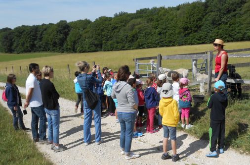 Sylvie nous accueille à la sortie du bus. En arrivant, des alpagas nous attendent en rang le long de la clôture. Avec leurs oreilles dressées, c'est impressionnant !